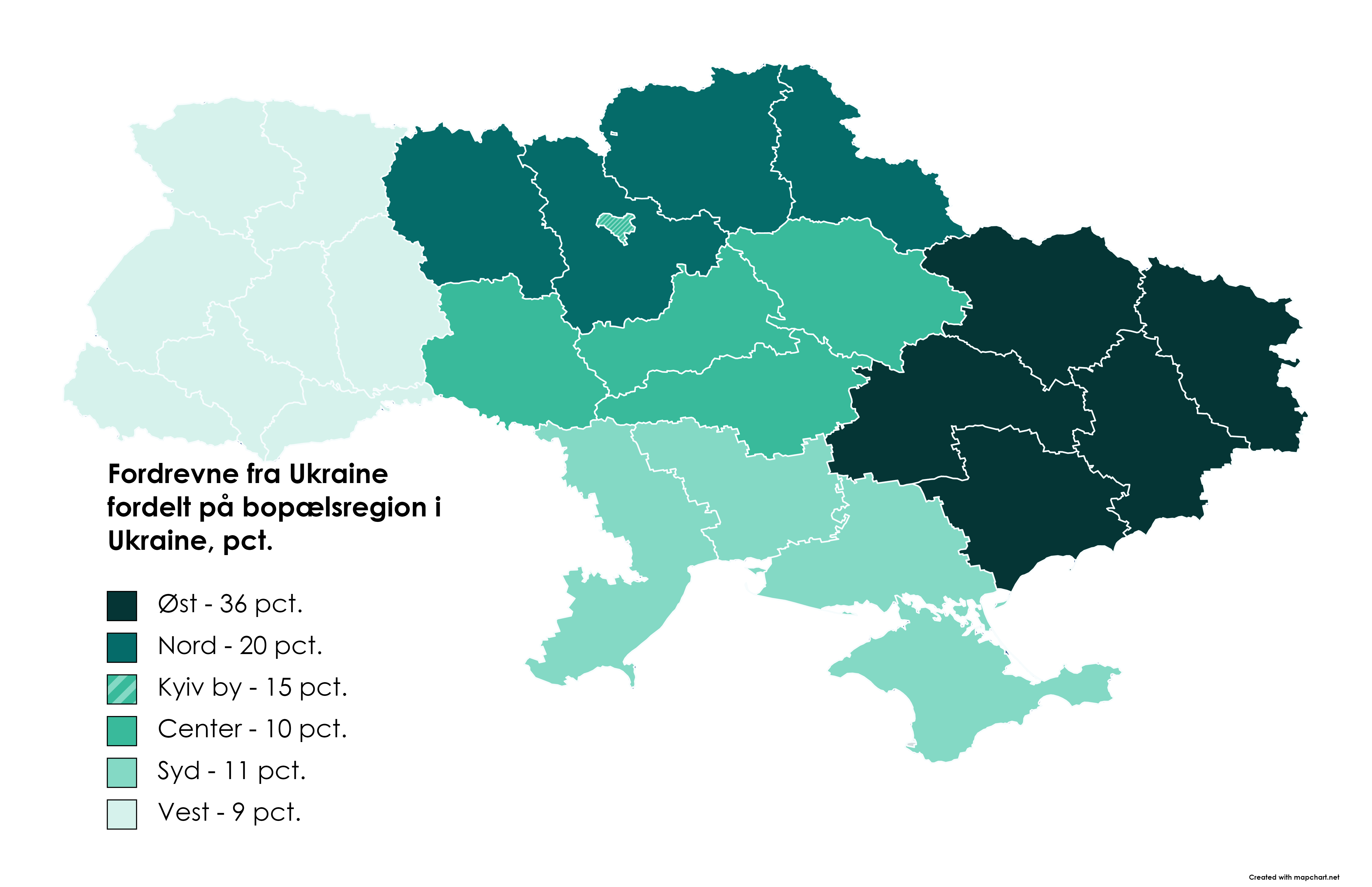 Fordrevne fra Ukraine i Danmark, fordelt på storregion i Ukraine, pct.